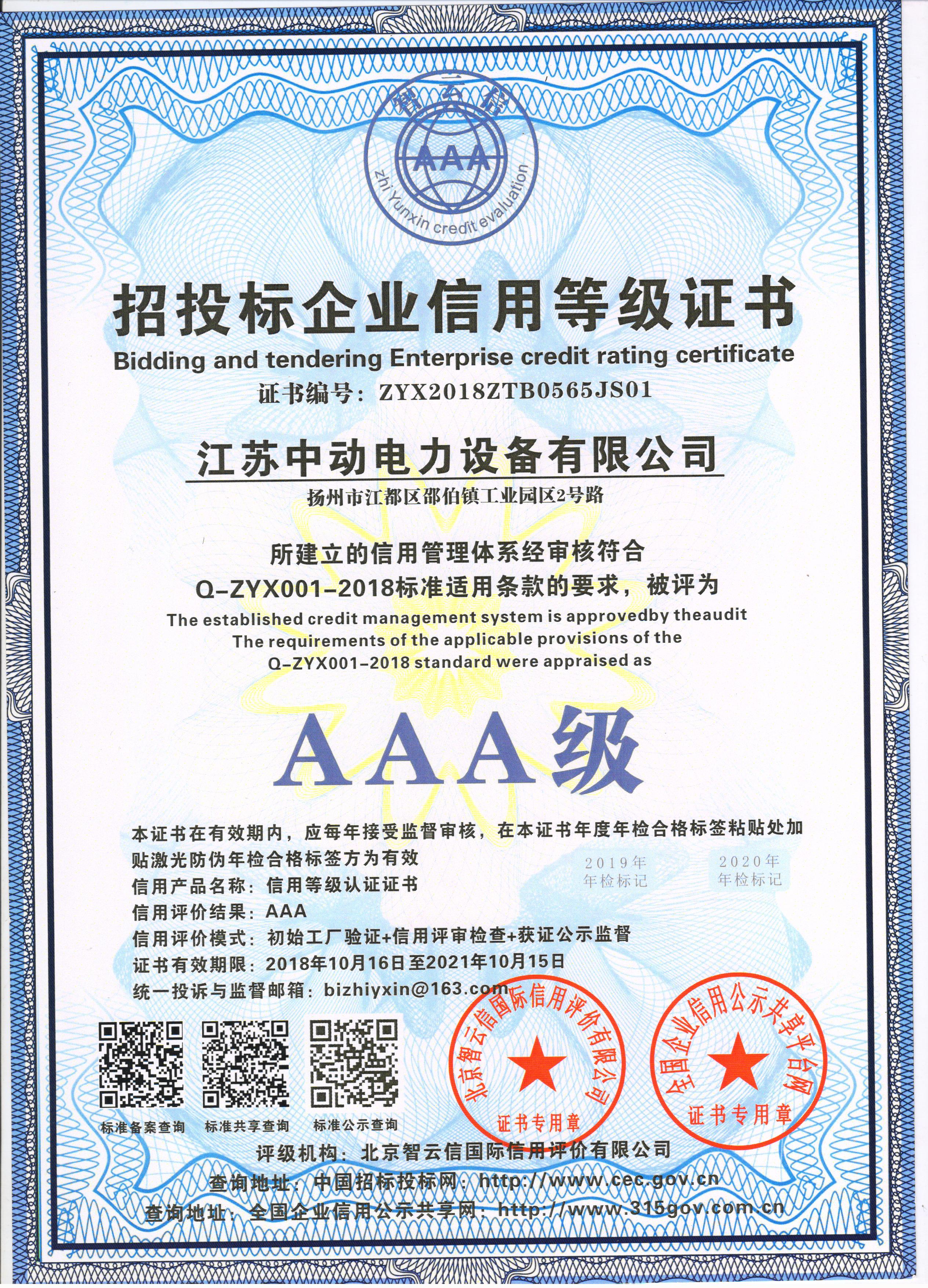 所建立的信用管理體系經(jīng)審核符合Q-ZYX001-2018標(biāo)準(zhǔn)適用條款的要求,被評為AAA級別。