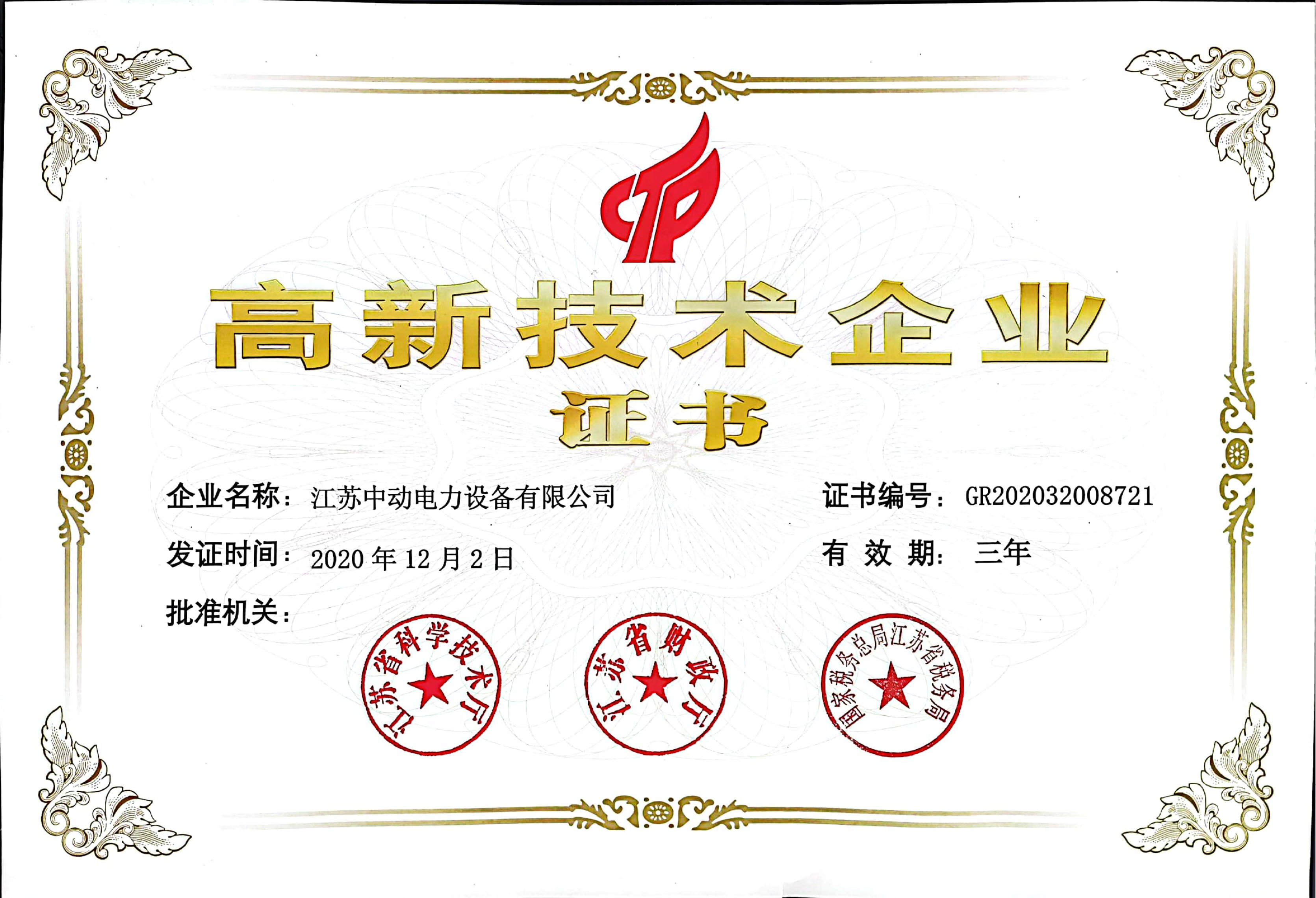 高新技術(shù)企業(yè)高新技術(shù)企業(yè)證書 江蘇中動電力設(shè)備有限公司榮獲高新技術(shù)企業(yè)